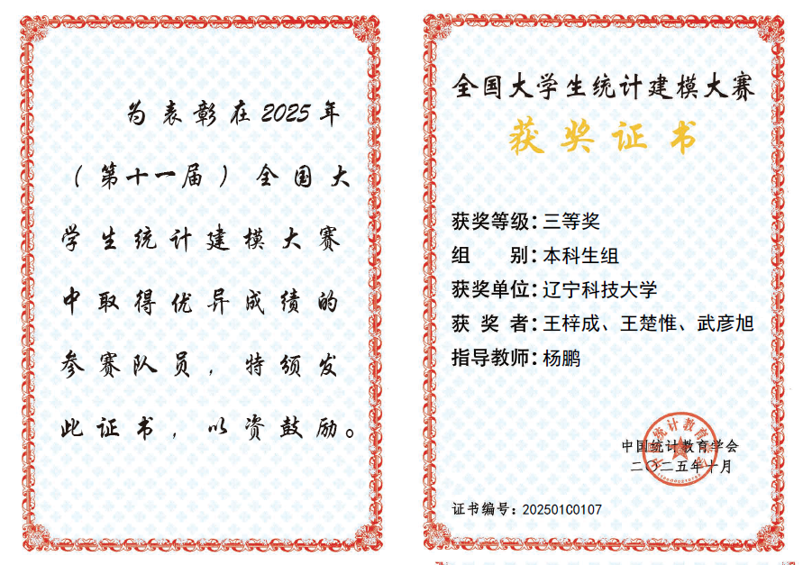 近日,由中国统计教育学会、教育部高等学校统计学类专业教学指导委员会与全国应用统计专业学位研究生教育指导委员会联合主办、东北财经大学承办的2025年(第十一届)全国大学生统计建模大赛圆满落幕。由九游在线官网_九游(中国)理学院杨鹏老师指导,王梓成、王楚惟、武彦旭团队创作的《基于SNN-TimesNet融合模型的股票价格预测研究》和吴佳美老师指导,孙浩男、张晰朗、陈锦涛团队创作的《社交媒体多模态数据的统计挖掘与抑郁倾向预测研究》荣获全国三等奖,创下我校参加该项赛事以来最好成绩。