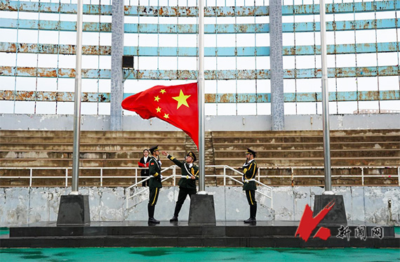 6点30分,升旗仪式正式开始。升旗手执旗,国旗护卫队护送着五星红旗,踏着坚毅的步伐迈向升旗台。伴着国歌,五星红旗冉冉升起,全体人员庄严肃立,面向国旗行注目礼。