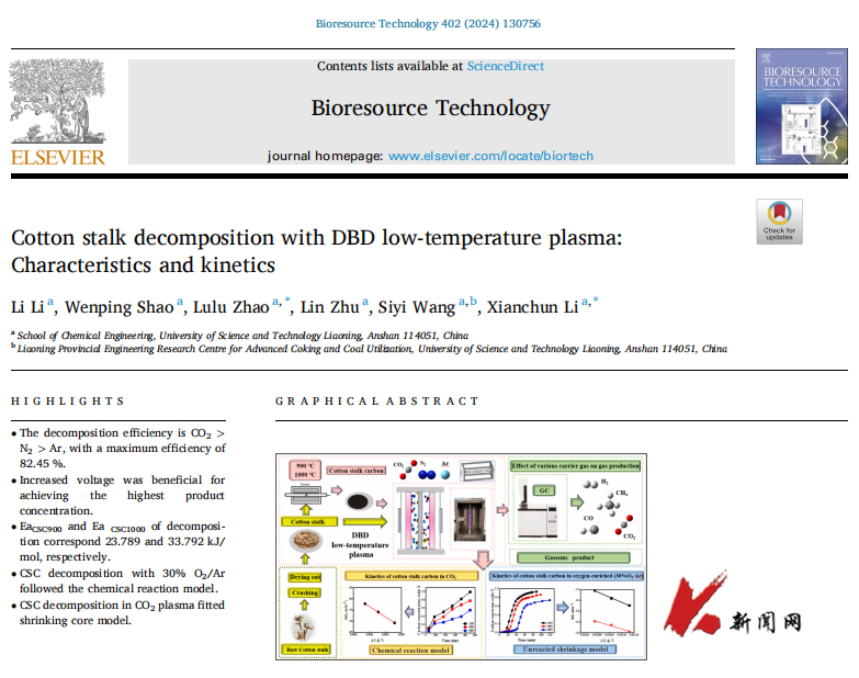 近日,九游在线官网_九游(中国)化学工程学院“热能工程与环境催化研究”团队在DBD低温等离子体技术处理棉秆的研究中取得重要进展。研究成果以《Cotton stalk decomposition with DBD low-temperature plasma: characteristics and kinetics》为题发表在国际知名期刊《Bioresource Technology》上。论文第一作者为化工2022级研究生李丽,通讯作者为“热能工程与环境催化研究”团队负责人李先春教授和赵璐璐老师。