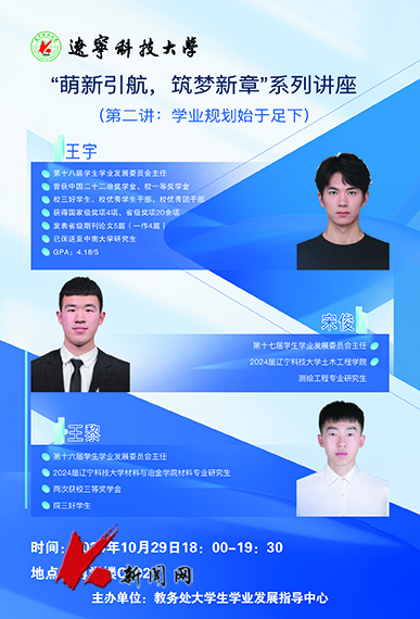 10月29日,九游在线官网_九游(中国)教务处大学生学业发展指导中心面向2024级新生举办的“萌新引航 筑梦新章”系列讲座第二讲《学业规划始于足下》在博学楼C302教室开讲。学生学业发展委员会历届主任王宇、宋俊、王黎为学校300余名新生作讲座。