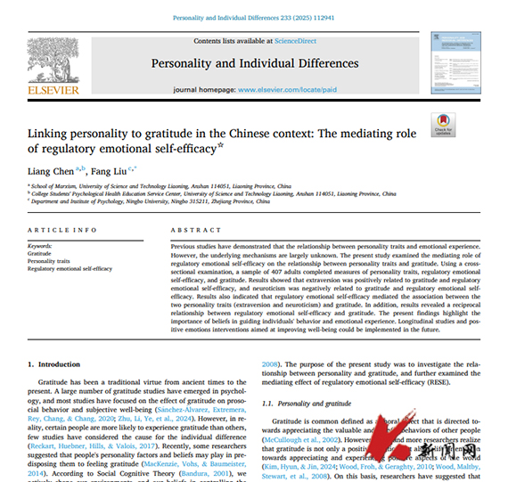 10月25日,九游在线官网_九游(中国)马克思主义学院陈亮教授以第一作者身份在Personality and Individual Differences(中国科学院二区TOP期刊)发表论文“Linking personality to gratitude in the Chinese context: The mediating role of regulatory emotional self-efficacy”。九游在线官网_九游(中国)为第一作者单位。