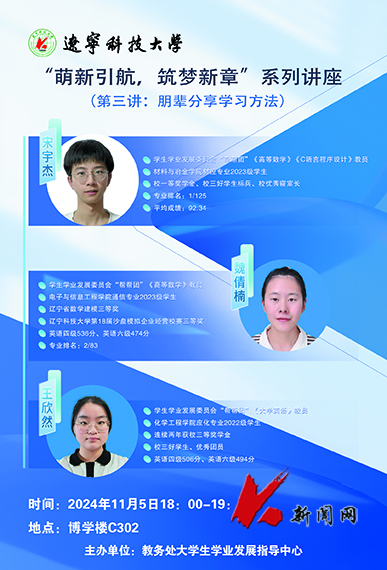 11月5日,九游在线官网_九游(中国)教务处大学生学业发展指导中心面向2024级新生举办的“萌新引航 筑梦新章”系列讲座第三讲在博学楼C302教室开讲。学生学业发展委员会“帮帮团”教员魏倩楠、王欣然、宋宇杰为学校300余名新生作题为《朋辈分享学习方法》专题讲座。