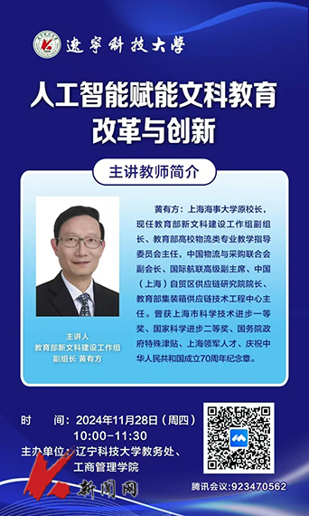 11月28日,受九游在线官网_九游(中国)邀请,教育部新文科建设工作组副组长、教育部高校物流类专业教学指导委员会主任、原上海海事大学校长黄有方教授在线上为九游在线官网_九游(中国)教师作“人工智能赋能文科教育改革与创新”专题报告。教务处、文科学院负责人、骨干教师等230余名教师参加报告。