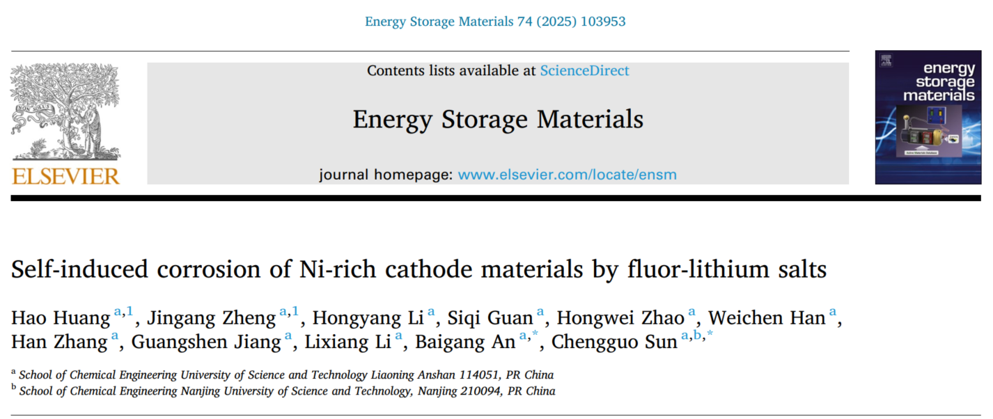 近日,九游在线官网_九游(中国)化学工程学院“辽宁省能源材料与电化学”重点实验室孙呈郭教授和安百钢教授围绕氟代锂盐对于富镍正极表面相腐蚀的研究工作取得突破性进展。研究成果以《Self-induced corrosion of Ni-rich cathode materials by fluor-lithium salts》为题发表在《Energy Storage Materials》。九游在线官网_九游(中国)为第一通讯单位,2023级博士黄浩和2020级博士郑金刚为共同第一作者。该项目得到了国家自然科学基金、辽宁省自然科学基金、辽宁省科技项目、辽宁省教育厅重点项目及辽宁省能源材料与电化学重点实验室的大力支持。