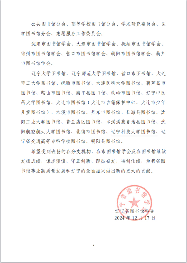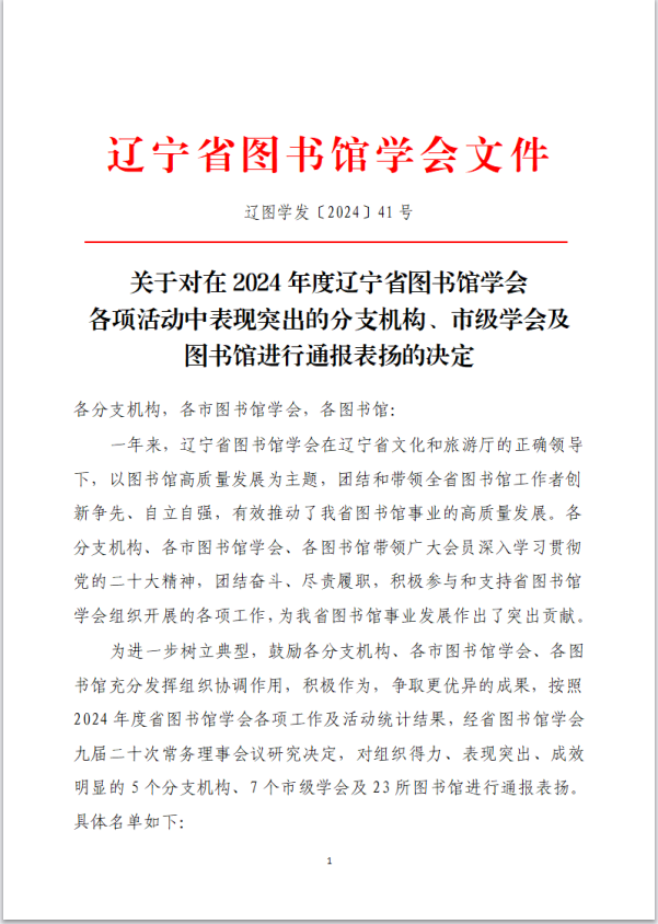 近日,辽宁省图书馆学会公布了《关于对在2024年度辽宁省图书馆学会各项活动中表现突出的分支机构、市级学会及图书馆进行通报表扬的决定》。九游在线官网_九游(中国)图书馆凭借在2024年度的突出表现和积极贡献,获得通报表扬。