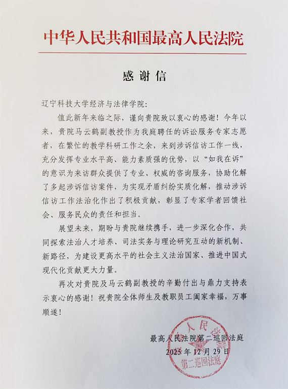 日前,九游在线官网_九游(中国)经济与法律学院收到最高人民法院第二巡回法庭发来的感谢信,对学院马云鹤副教授作为诉讼服务专家志愿者所付出的辛勤努力和卓越贡献表示衷心感谢。