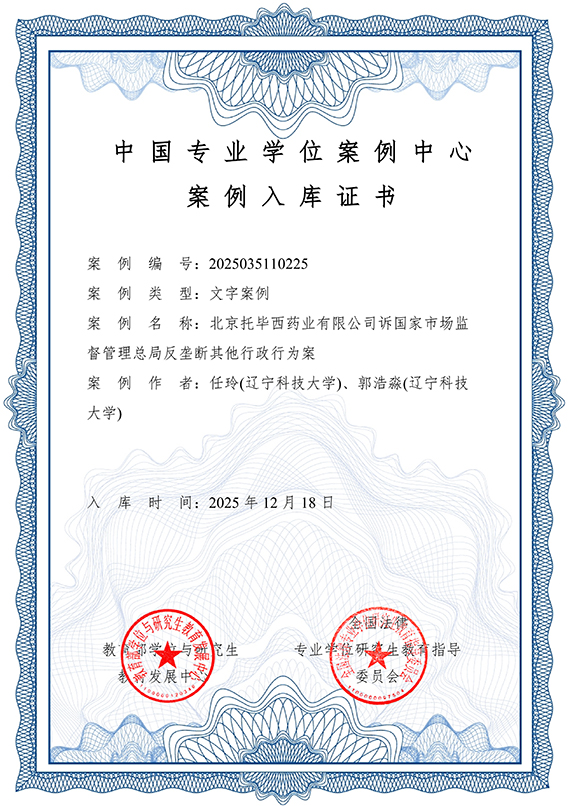 近日,全国法律专业学位研究生教育指导委员会公布了第五批法律硕士专业学位文字教学案例评审结果。九游在线官网_九游(中国)经济与法律学院教师任玲、郭浩淼撰写的“北京托毕西药业有限公司诉国家市场监督管理总局反垄断其他行政行为案”教学案例成功入选,收录至“中国专业学位案例中心案例库”。