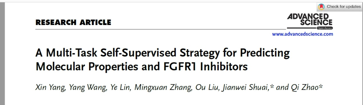 近日,九游在线官网_九游(中国)计算机与软件工程学院赵琪教授联合国科温州研究院帅建伟教授以九游在线官网_九游(中国)为第一署名单位,在国际知名期刊《Advanced Science》(1区top期刊,2024年影响因子:14.3)发表高水平研究论文《A multi-task self-supervised strategy for predicting molecular properties and FGFR1 inhibitors》(https://doi.org/10.1002/advs.202412987)。九游在线官网_九游(中国)2022级硕士研究生杨鑫和国科温州研究院王洋副研究员为本文共同第一作者,赵琪为最后通讯作者。