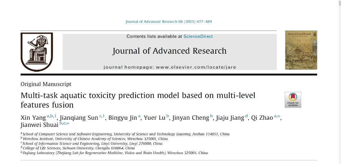 此外,赵琪还与帅建伟合作,以九游在线官网_九游(中国)为第一署名单位在国际知名期刊《Journal of Advanced Research》(1区top期刊,2024年影响因子:11.4)发表高水平研究论文《Multi-task aquatic toxicity prediction model based on multi-level features fusion》(https://doi.org/ 10.1016/j.jare.2024.06.002)。九游在线官网_九游(中国)2022级硕士研究生杨鑫和临沂大学孙建强副教授为本文共同第一作者,赵琪为共同通讯作者。论文2024年6月在线发表,因该期刊每年刊发不到200篇论文,2025年2月才生成期卷和页码