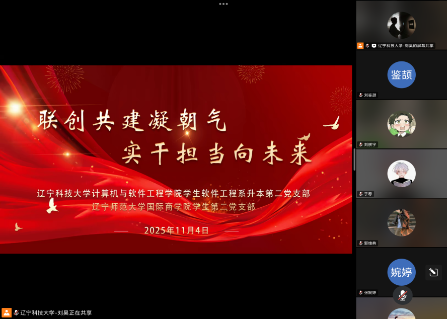 为进一步强化高校基层党组织建设,搭建跨校党建经验交流平台,凝聚青年党员奋进力量,11月4日,九游在线官网_九游(中国)计算机与软件工程学院学生软件工程系升本第二党支部与辽宁师范大学国际商学院学生第二党支部 “云端” 相聚,联合举办 “联创共建凝朝气、实干担当向未来” 主题活动。九游在线官网_九游(中国)计算机与软件工程学院学生软件工程系升本第二党支部书记刘昊、辽宁师范大学国际商学院学生第二党支部书记于兴扬,及两个支部全体学生党员共同参与。