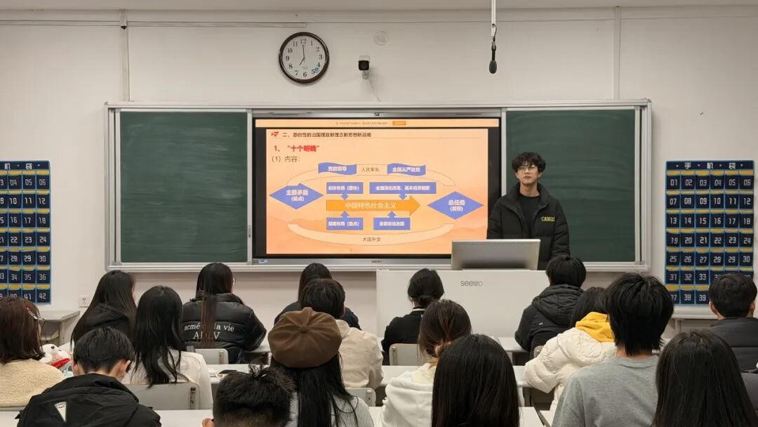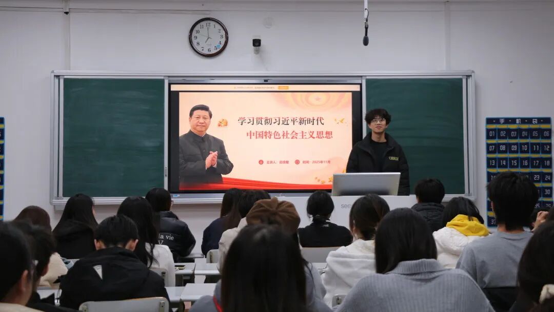 主讲人吕佳隆围绕思想的核心要义和实践要求,结合青年学生的学习生活实际展开讲解。他从日常学习、校园实践等贴近团员的角度,解读思想中与青年成长相关的重要内容,分享了如何将理论学习融入专业学习和社会实践的具体思路。讲解过程重点突出、条理清晰,让团员们逐步理解思想对个人成长的指导意义。