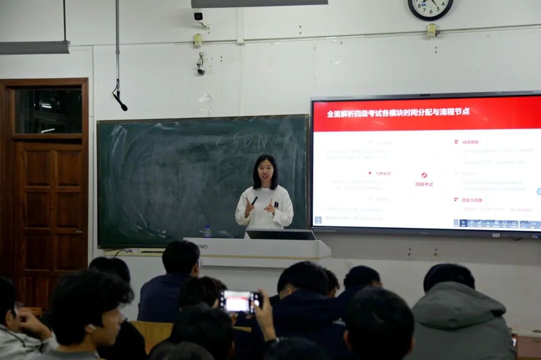 分享会上,倪嘉蔚围绕四级考试核心模块,从时间规划、听力训练、阅读技巧、写作提升及词汇积累五个方面展开详细讲解。她强调,四级考试时间分配是通关关键,优先攻克高分题型,建议写作预留30分钟完成,并预留5分钟检查。针对听力部分,她建议利用试音时间圈画关键词、预判场景,要边听边涂卡,避免漏填。阅读部分则聚焦“定位+同义替换”核心技巧,指导同学们分题型突破,合理安排答题顺序。写作方面,推荐三段式结构,鼓励大家积累高频句型与话题素材,灵活运用衔接词与具体事例增强文章逻辑性与充实度。此外,她还提醒同学们重视词汇积累,借助学习软件与核心词汇书反复巩固,筑牢备考基础。