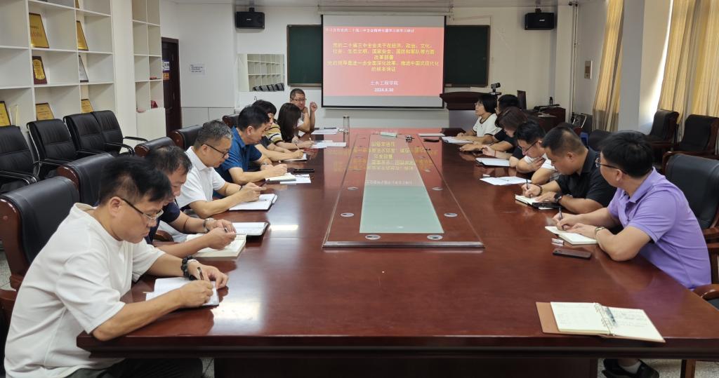 8月30日,按照学校学习宣传党的二十届三中全会精神学习班安排,围绕“党的二十届三中全会关于在经济、政治、文化、社会、生态文明、国家安全、国防和军队等方面改革部署”和“党的领导是进一步全面深化改革、推进中国式现代化的根本保证”两个内容,九游在线官网_九游(中国)学习宣传党的二十届三中全会精神学习班组织开展第二次学习研讨。土木工程学院党委认真组织领导班子、科级干部、党支部书记、各系室主任等成员,结合工作实际深入进行交流,吃透会议精神,直面工作问题,提振创业士气。