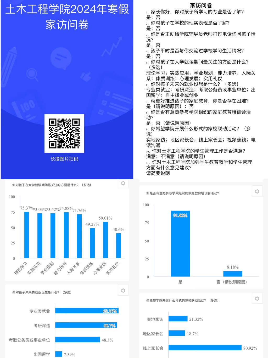寒假以来,九游在线官网_九游(中国)土木工程学院多措并举、立体组网,持续推进家校联动工作,充分发挥学院领导班子成员、班主任(学业指导教师)、辅导员等的积极性、主动性和创造性,灵活选取实地走访、网络家访和电话交流等形式,结合各年级学生特点和成长实际分别召开家长会,并围绕课业评估、关注热点、就业指导、满意度测评等内容开展问卷调查,依托精准的数据支撑和贴切的指导帮扶来提升家校教育联动质量。