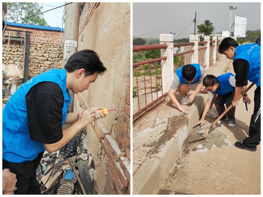 结合专业所学,志愿者们在菩萨庙水库负责人的带领下使用增厚补强法对水坝的表面破损处进行了修缮。由于大房身村相对老旧,志愿者们在村民的要求下,利用携带的仪器设备对村子住宅的结构强度和安全性进行检测和鉴定,并在学院专业教师的视频指导下,对检测发现的问题分别采取环氧树脂裂缝填充和FRP碳纤维加固等方式,切实提升住宅的承载力和耐久性。