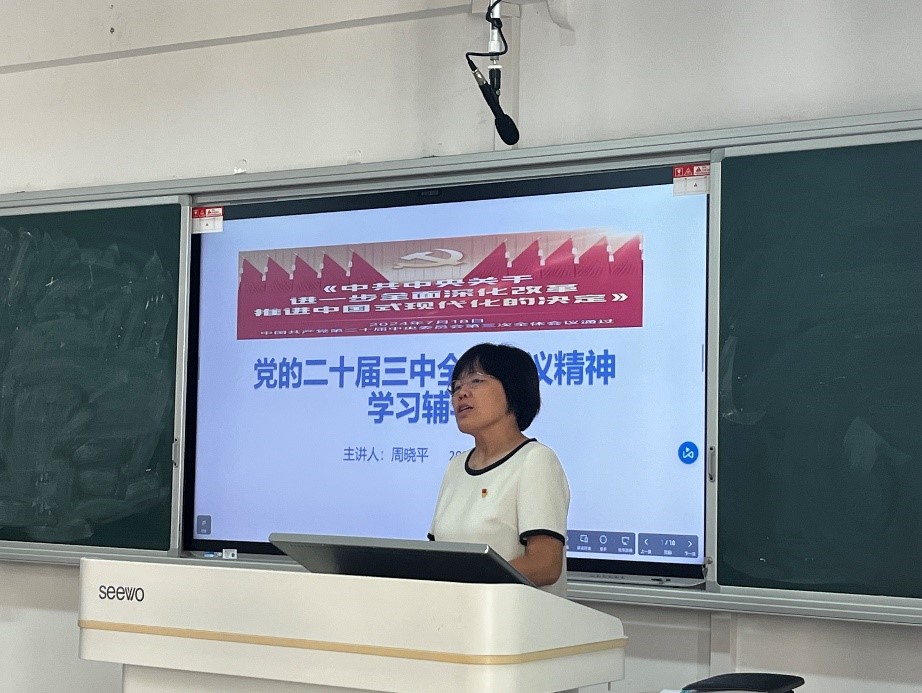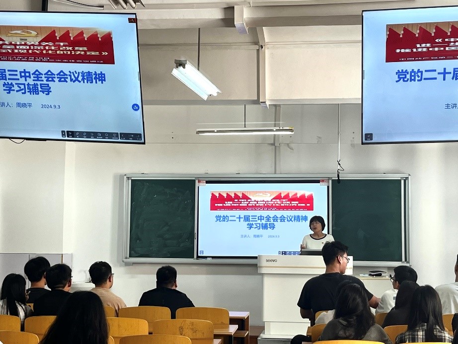 9月3日,土木工程学院党委为深入实施“时代新人铸魂工程”,教育引导研究生增强践行“两个维护”的高度自觉、坚定爱国奋斗挺膺担当,以实际行动迎接中华人民共和国成立75周年,党委书记、辅导员周晓平在土木楼A508为研土木22、23级研究生作了《学习宣传党的二十届三中全会精神》辅导报告。周晓平教授重点讲述《中共中央关于进一步全面深化改革、推进中国式现代化的决定》的三部分内容,一是进一步全面深化改革、推进中国式现代化的重要意义和总体要求,二是从经济、政治、文化、社会、生态文明、 国家安全、国防和军队等方面部署改革,三是加强党对改革的领导、深化党的建设制度改革、党风廉政建设和反腐败斗争。此次学习辅导加深了同学们对《决定》的理解,为今后青年学生的职业规划、学习发展指明了方向。