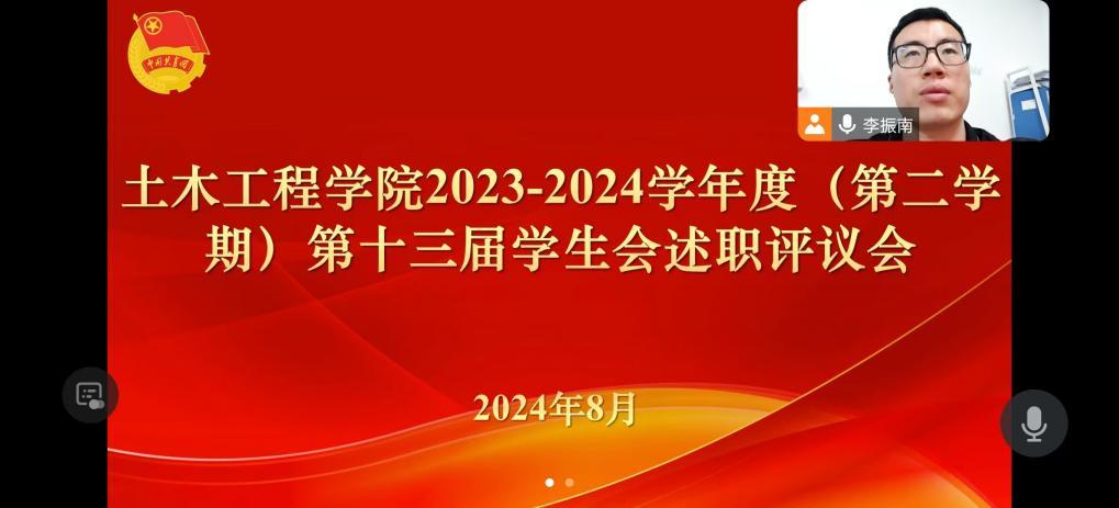 为进一步加强土木工程学院学生会建设,发挥学生会联系广大同学的桥梁纽带作用,推动学生 会组织管理工作科学化、规范化,8月14日,土木工程学院2023-2024学年度(第二学期)第十三届学生会述职评议会在线上召开。土木工程学院党委副书记王一、团委副书记李振南以及学生会全体 成员参加评议会。