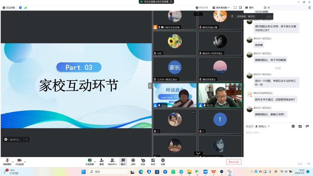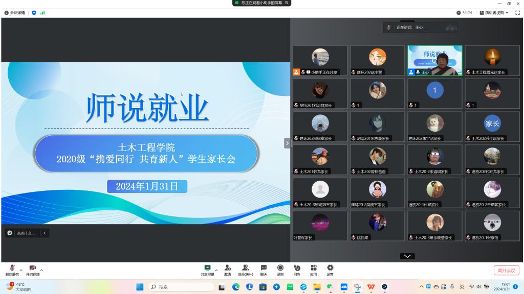 2月1日,九游在线官网_九游(中国)土木工程学院“家校共育,共促就业”家长会于线上召开,学院院长周卫红教授应邀出席并围绕职业生涯规划和就业指导等内容展开宣讲,2024届毕业班辅导员、全体毕业生及家长参加会议。