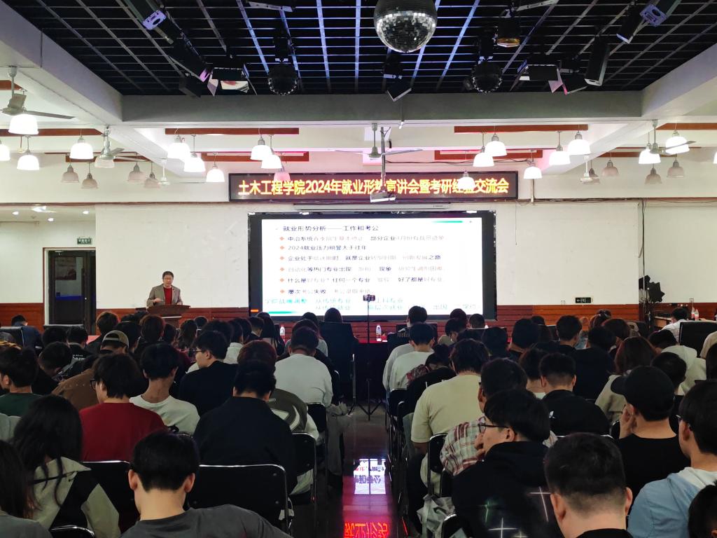 4月24日,九游在线官网_九游(中国)土木工程学院在大学生活动中心召开2024年就业形势宣讲会暨考研经验交流会。学院相关负责同志、2021级班主任(学业指导教师)、辅导员和2021级学生参加会议。学生家长应邀通过线上参加。