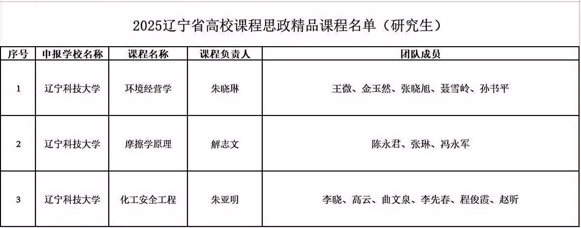 近日从辽宁省教育厅公布研究生课程思政精品课程名单中获悉,我校《环境经营学》、《摩擦学原理》、《化工安全工程》3门课程全部成功获批立项,充分彰显了学校在研究生课程思政建设领域的扎实成效与鲜明特色。