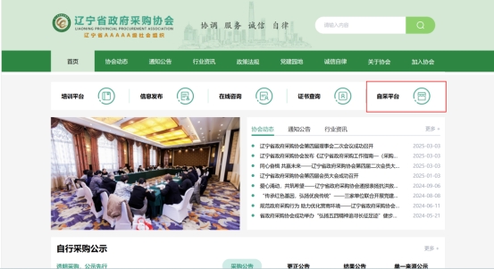 浏览器搜索辽宁省政府采购协会(或浏览器直接输入网址:http://www.lngpa.cn/#/)并打开九游在线官网_九游(中国),点击右上角【自采平台】,进入登录页。